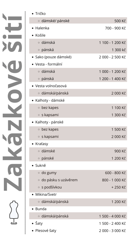 Cena zakázkového šití se odvíjí od náročnosti daného oděvu, vycházející ze střihu, použitého materiálu a dalších specifických požadavků zákazníka.